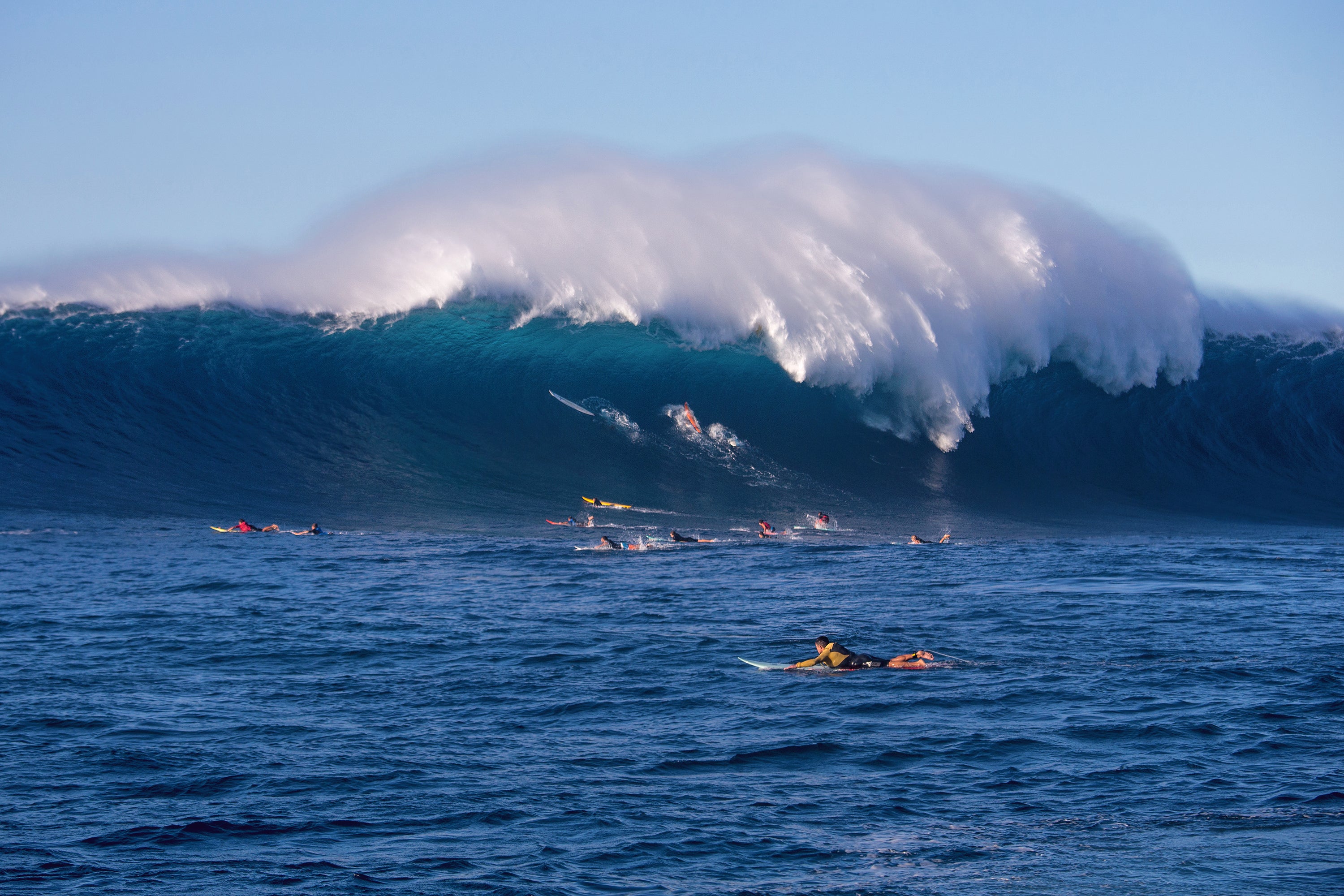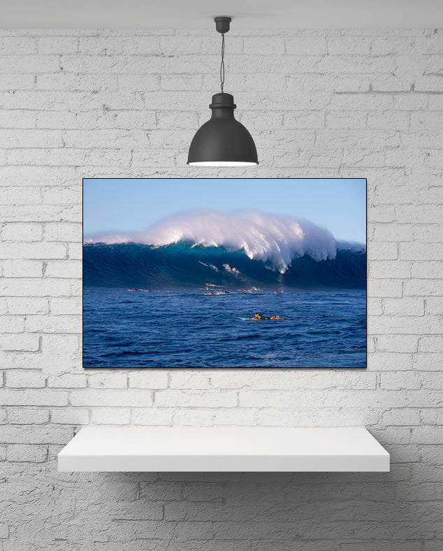 This striking image captures,a massive wave crashes over the entire lineup, highlighting the sheer intensity and danger of big-wave surfing. Surfers here face not only the overwhelming force of the ocean but also the unpredictable elements, requiring years of physical training, mental focus, and spiritual discipline to navigate these moments safely. Each ride demands split-second decisions, unwavering courage, and deep respect for the sea a true test of the body, mind, and soul in the most extreme conditions the sport has to offer.