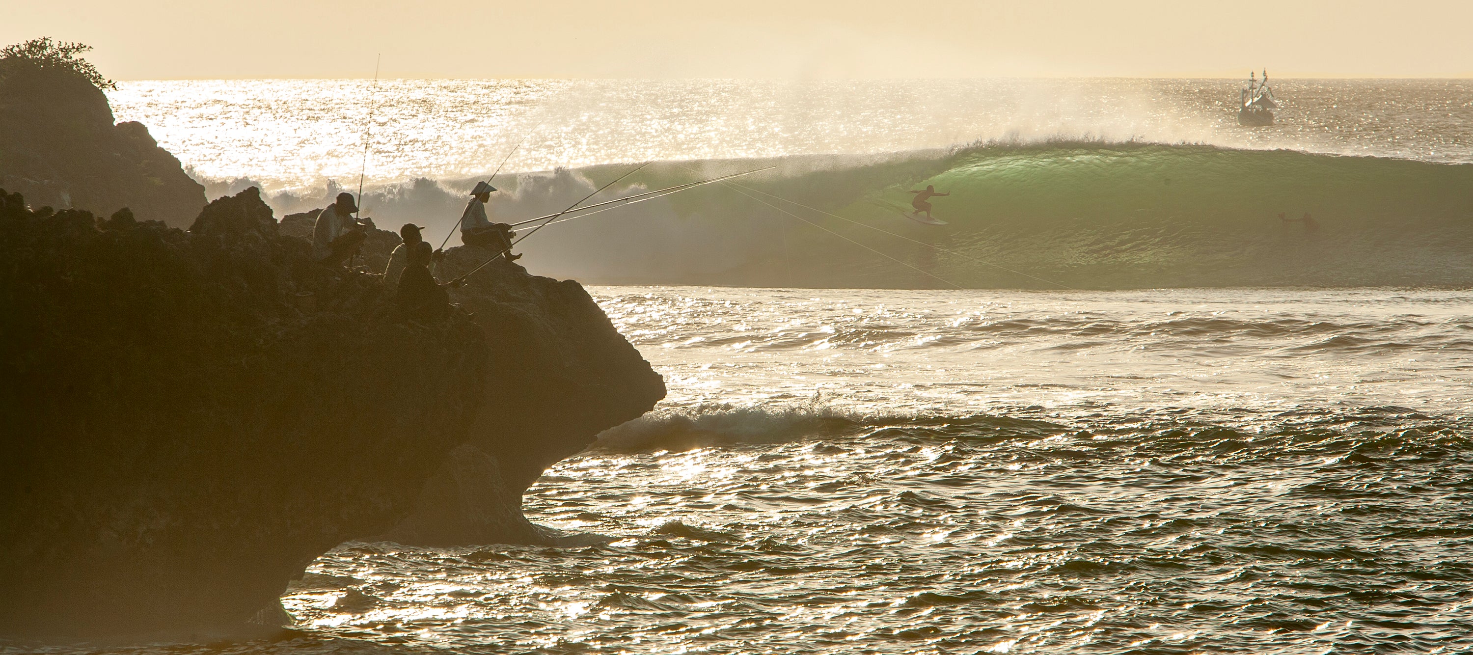 At sunset in Bali, Indonesia, a surfer rides a flawless barrel backlit while a fisherman stands on the rocky cliffs casting his line, embodying the island’s timeless connection between people, ocean, and culture. The panoramic scene captures not only the power and grace of the wave, but also the ritual, rhythm, and harmony of Balinese life, turning a fleeting moment into a living portrait of surf, tradition, and nature.