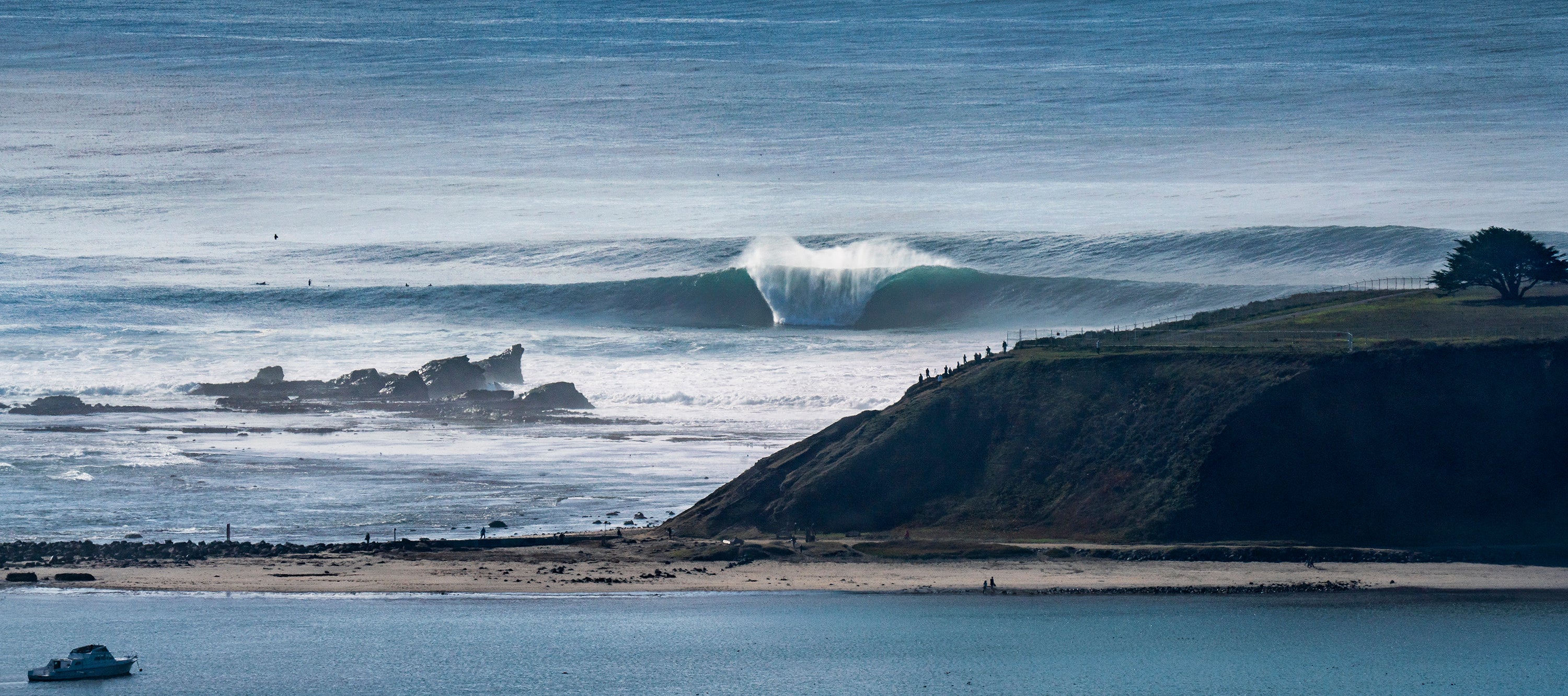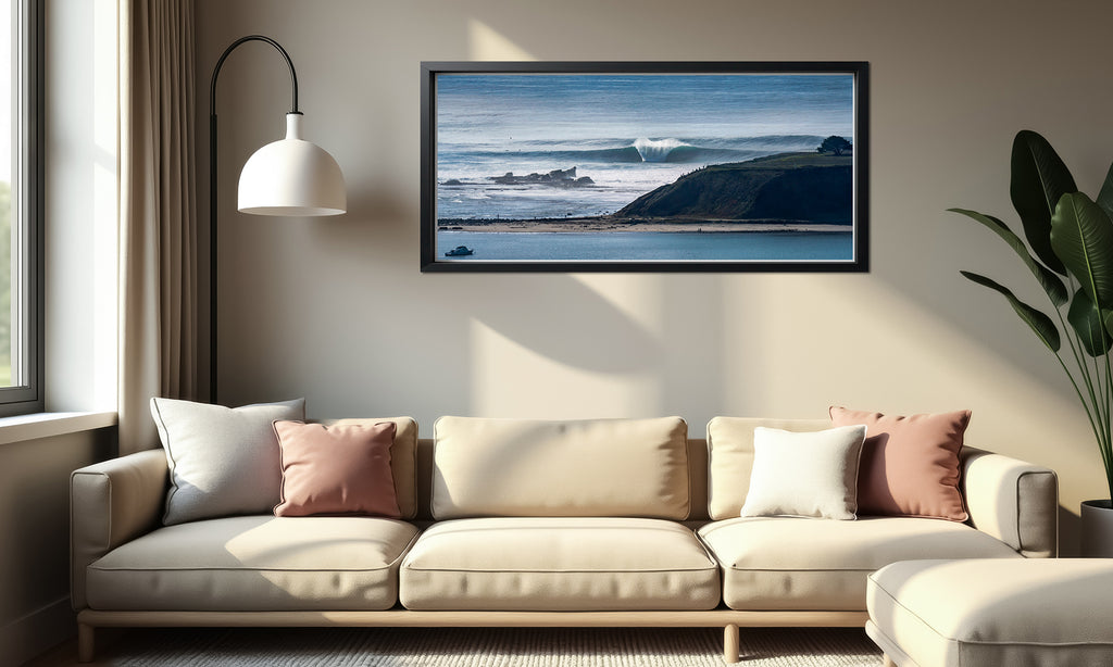 Mavericks is a place of awe and intimidation, where the ocean turns dark and powerful under gray skies and cold Pacific waters. The wave rises suddenly from the deep, forming massive walls of steel-blue water that crash with relentless force over the shore, uneven rocks. It’s a place that commands respect, a break both beautiful and brutal, where even the best surfers feel fear. The cold, the weight of the swell, and the sound of the ocean detonating, create an atmosphere that’s as haunting as it is magnificent. This photograph captures that energy, the drama, the dimension and raw spirit of a wave that defines what it means to truly challenge nature.